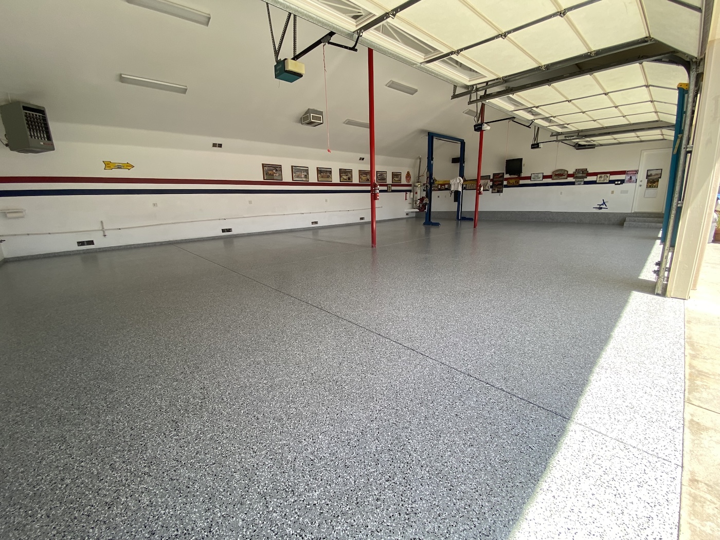 Color flake epoxy is our most popular multi-layered system for those seeking a textured, visually stunning surface. By incorporating decorative vinyl chips into the epoxy, we create a "liquid granite" effect that adds incredible depth and character to any space. This system is one of our most durable and cost-effective finishes, specifically designed to mask concrete imperfections and "hammered" slabs while providing a beautiful, uniform look. Beyond its aesthetics, the flake texture provides natural slip resistance—making it the ideal safety-first solution for residential garages, workshops, and high-traffic commercial environments.